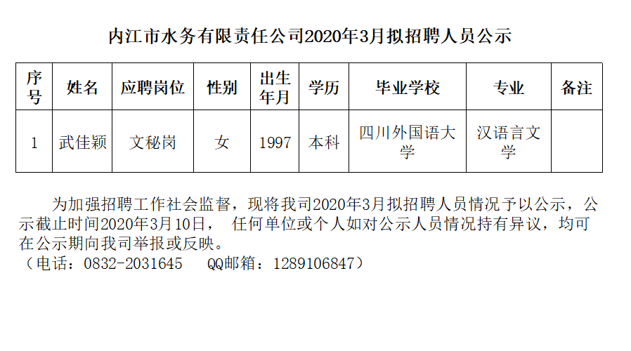 內(nèi)江市水務(wù)有限責(zé)任公司2020年3月擬招聘人員公示