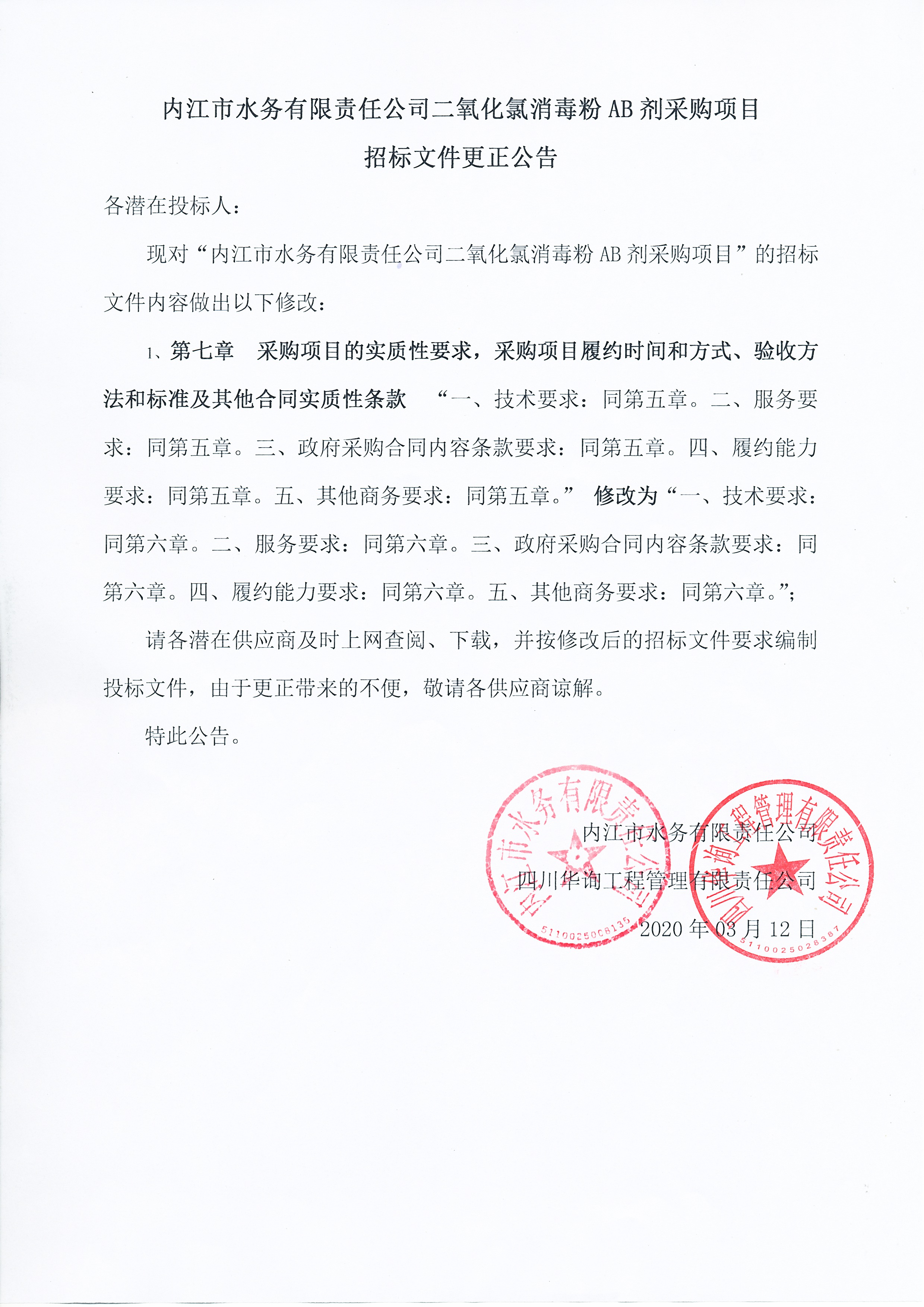 內(nèi)江市水務(wù)有限責(zé)任公司二氧化氯消毒粉AB劑采購項目招標文件更正公告