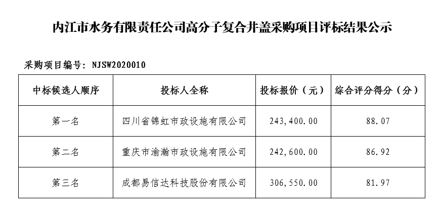 內(nèi)江市水務(wù)有限責(zé)任公司高分子復(fù)合井蓋采購項(xiàng)目評(píng)標(biāo)結(jié)果公示