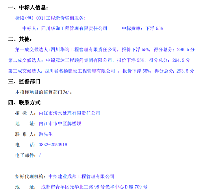 內(nèi)江市第二污水處理廠(chǎng)二期工程造價(jià)咨詢(xún)服務(wù)項(xiàng)目中標(biāo)結(jié)果公示