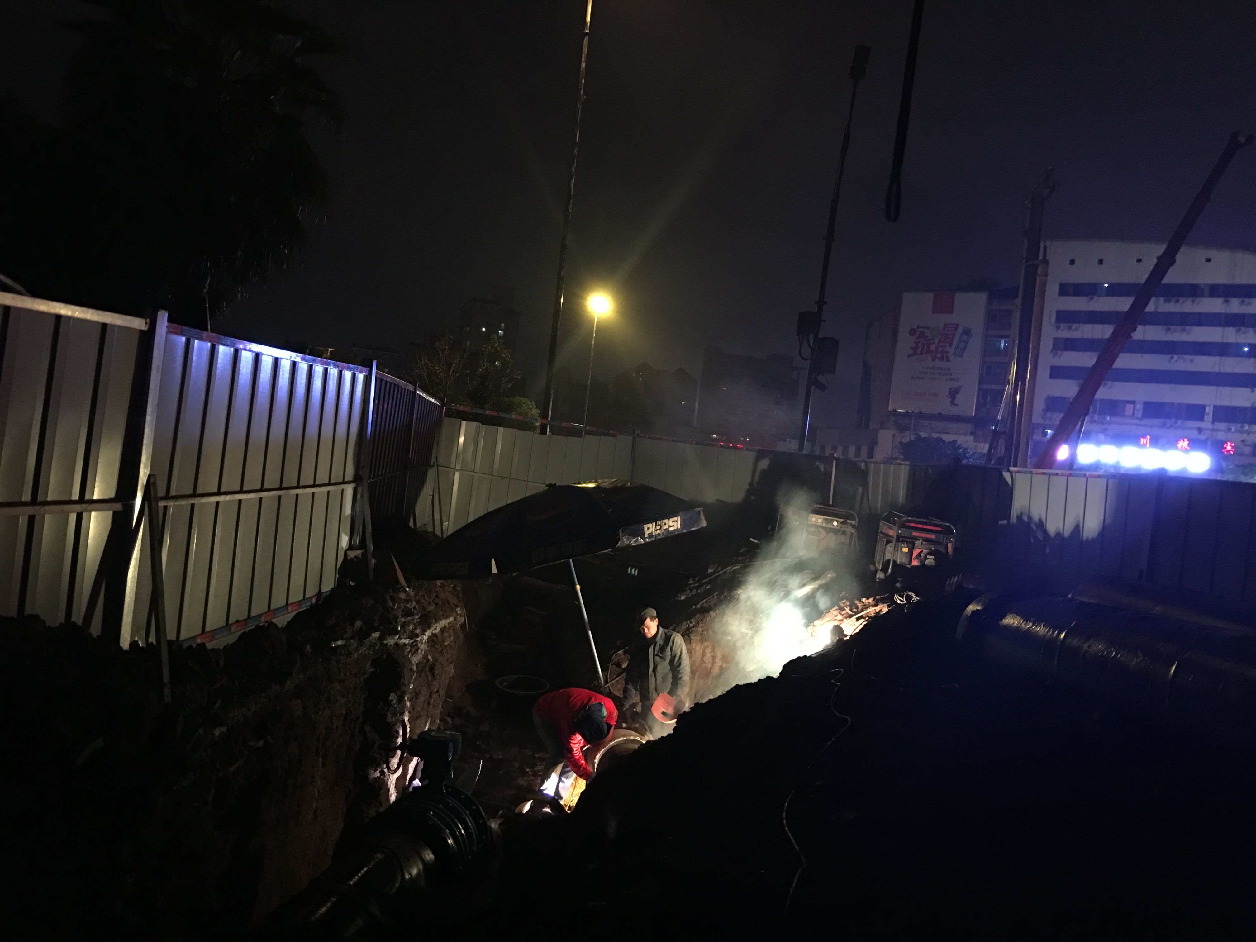 內江市水務有限責任公司為配合西林大橋南北下穿工程順利進行,積極組織豪盛安裝公司、工程管理部、管網(wǎng)運行部等相關部門進行西林大橋南北橋頭下穿DN500給水管道改造。為保證附近居民白天的正常用水,我司特意把工期定在晚上和凌晨。2016年11月22日晚上11點多,陰雨綿綿,寒風刺骨,公司黨委副書記、紀委書記、工會主席李濤帶領黨群工作部提上涼菜、面包和牛奶到施工現(xiàn)場慰問挑燈夜戰(zhàn)、頂風作業(yè)的加班人員。他們不畏嚴寒、不知饑餓,只為不影響居民正常生活、保證城市安全供水埋頭苦干的水務人,讓我們不得不心生敬意。