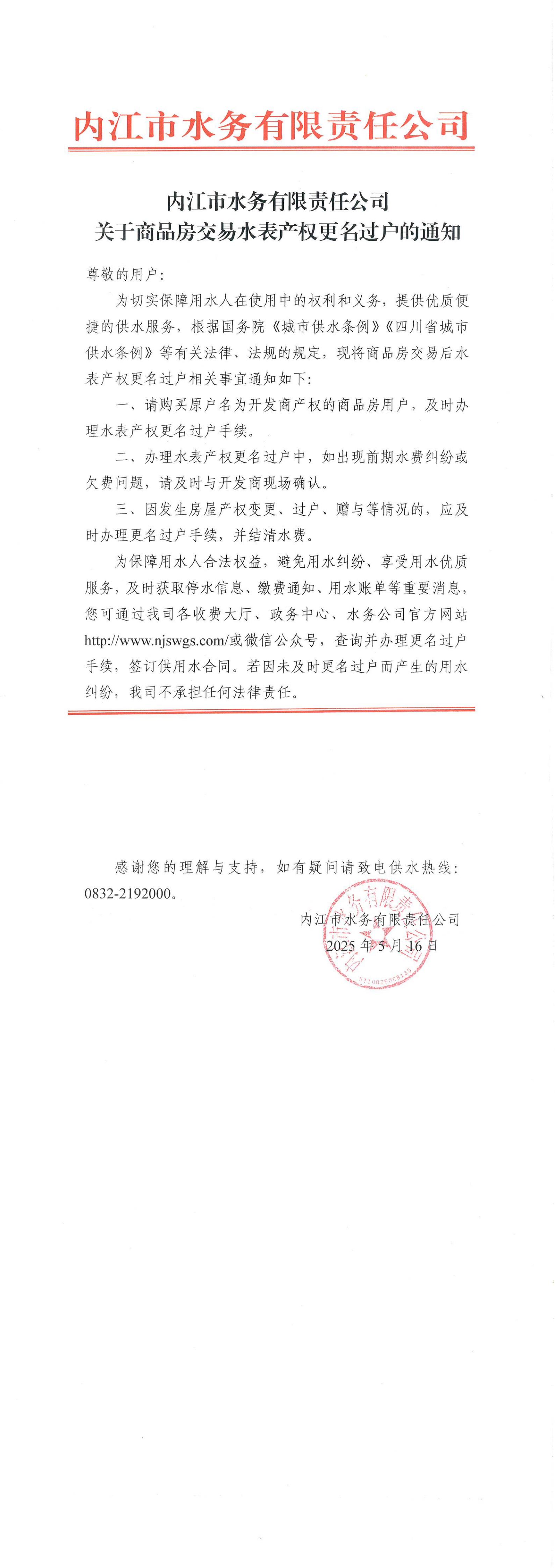 內(nèi)江市水務(wù)有限責(zé)任公司關(guān)于商品房交易水表產(chǎn)權(quán)更名過(guò)戶的通知